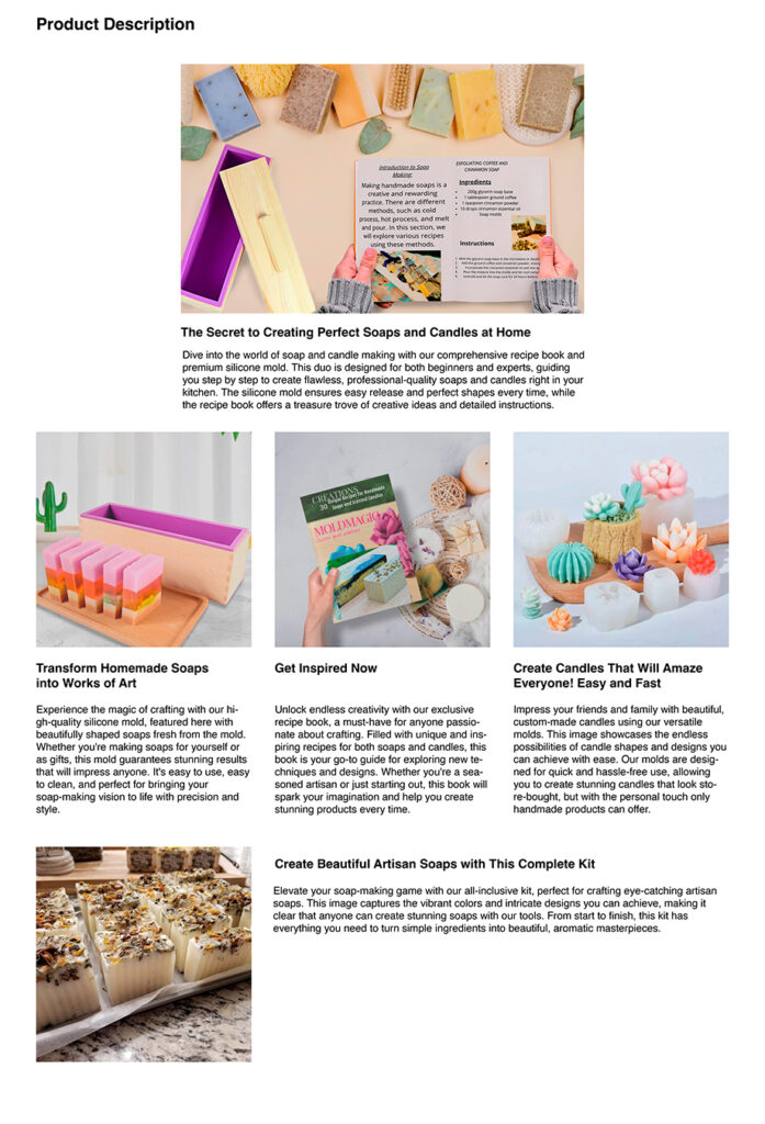 Nuestro servicio de diseño para listados de Amazon incluye la creación de imágenes atractivas y optimizadas, redacción de descripciones de producto persuasivas y bien estructuradas, y la optimización de títulos y bullet points para mejorar la visibilidad y tasa de conversión. También realizamos un análisis de tus competidores para asegurarnos de que tu listado se destaque.