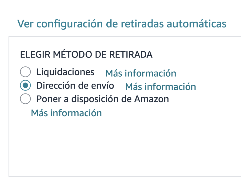 La tercera opción es pedir que te envíen el inventario a tu dirección para venderlo fuera de Amazon: otros marketplaces, ventas locales, packs, etc.